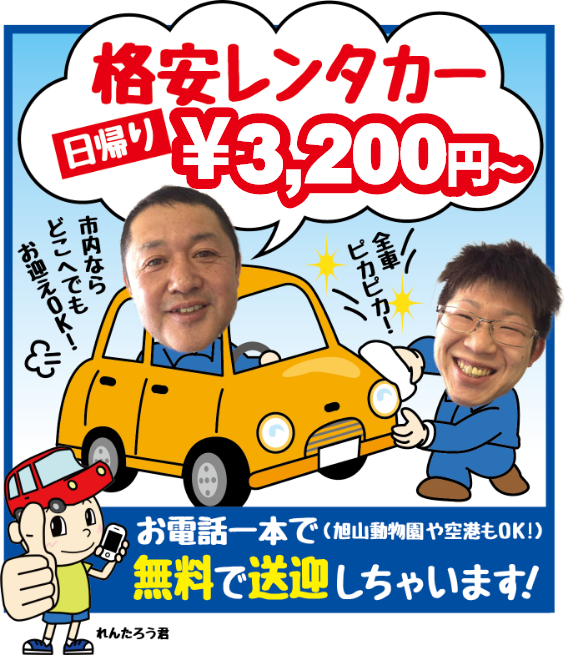 これらを効率的に周遊するにはレンタカーは欠かせません。旭川空港・JR旭川駅・ホテル等、旭川市全域無料送迎、そしてお得な料金の当店をご利用いただき、思いっきり北海道を楽しんで下さい。